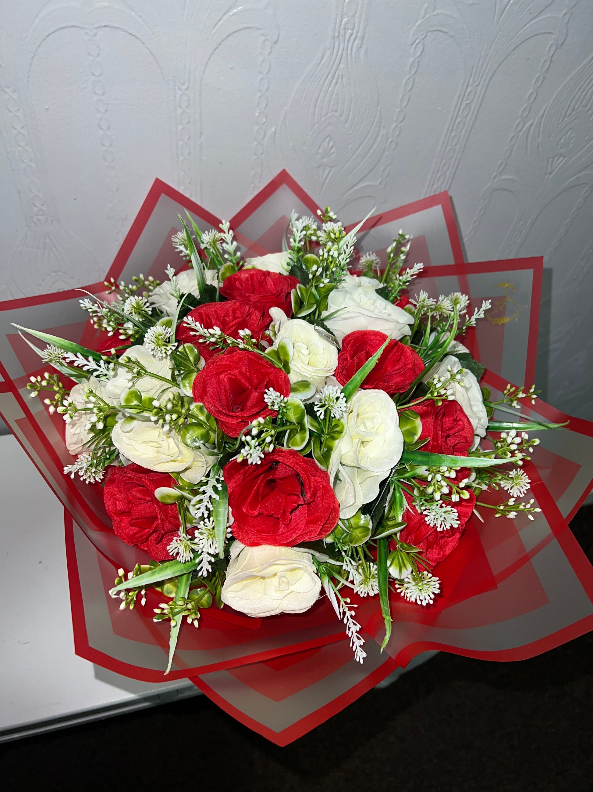 Bring timeless beauty and elegance into any space with this handcrafted red and white artificial flower bouquet. Designed with lifelike silk roses, lush greenery, and delicate detailing, this stunning arrangement captures the essence of love and sophistication — without ever wilting.