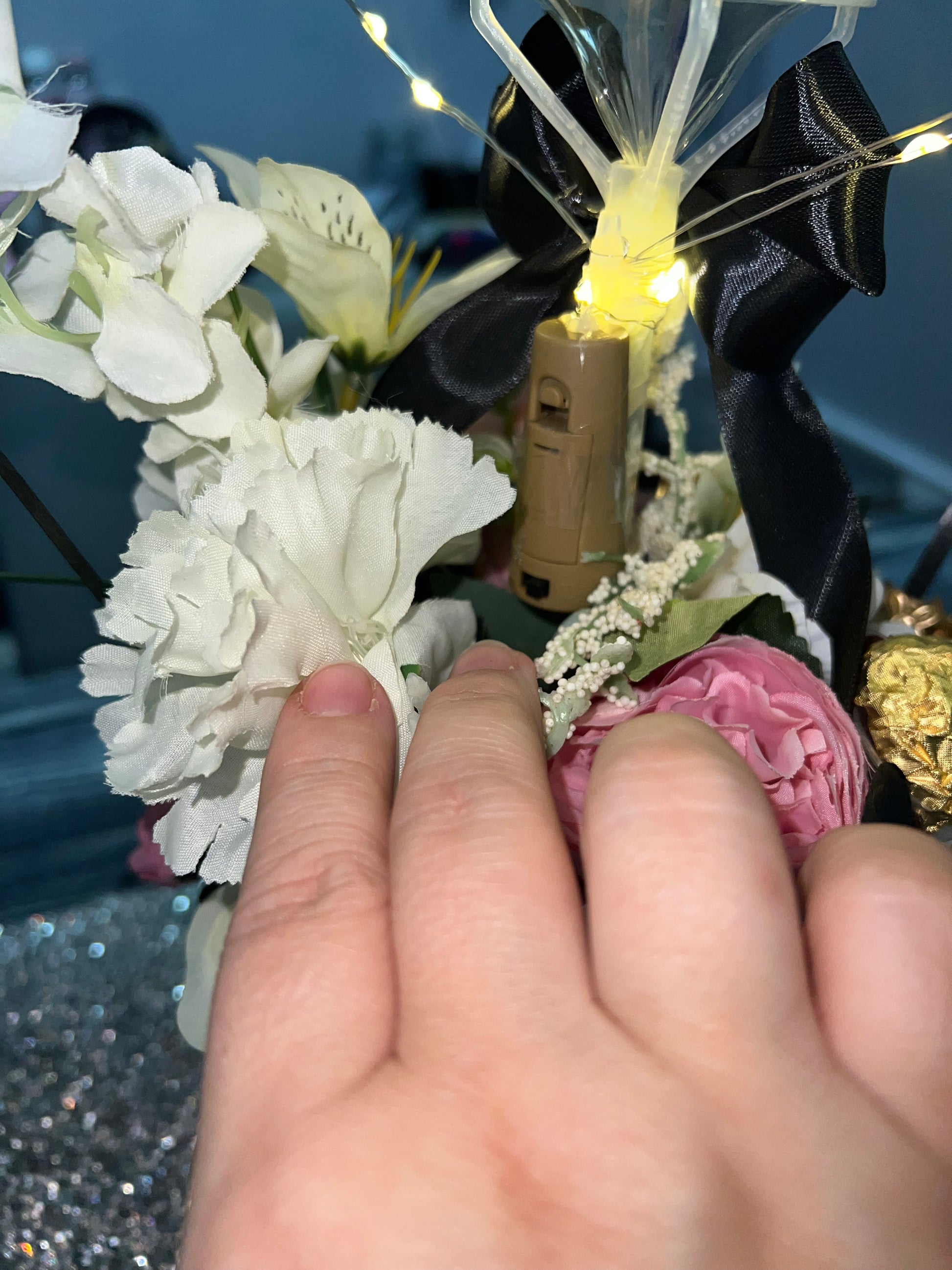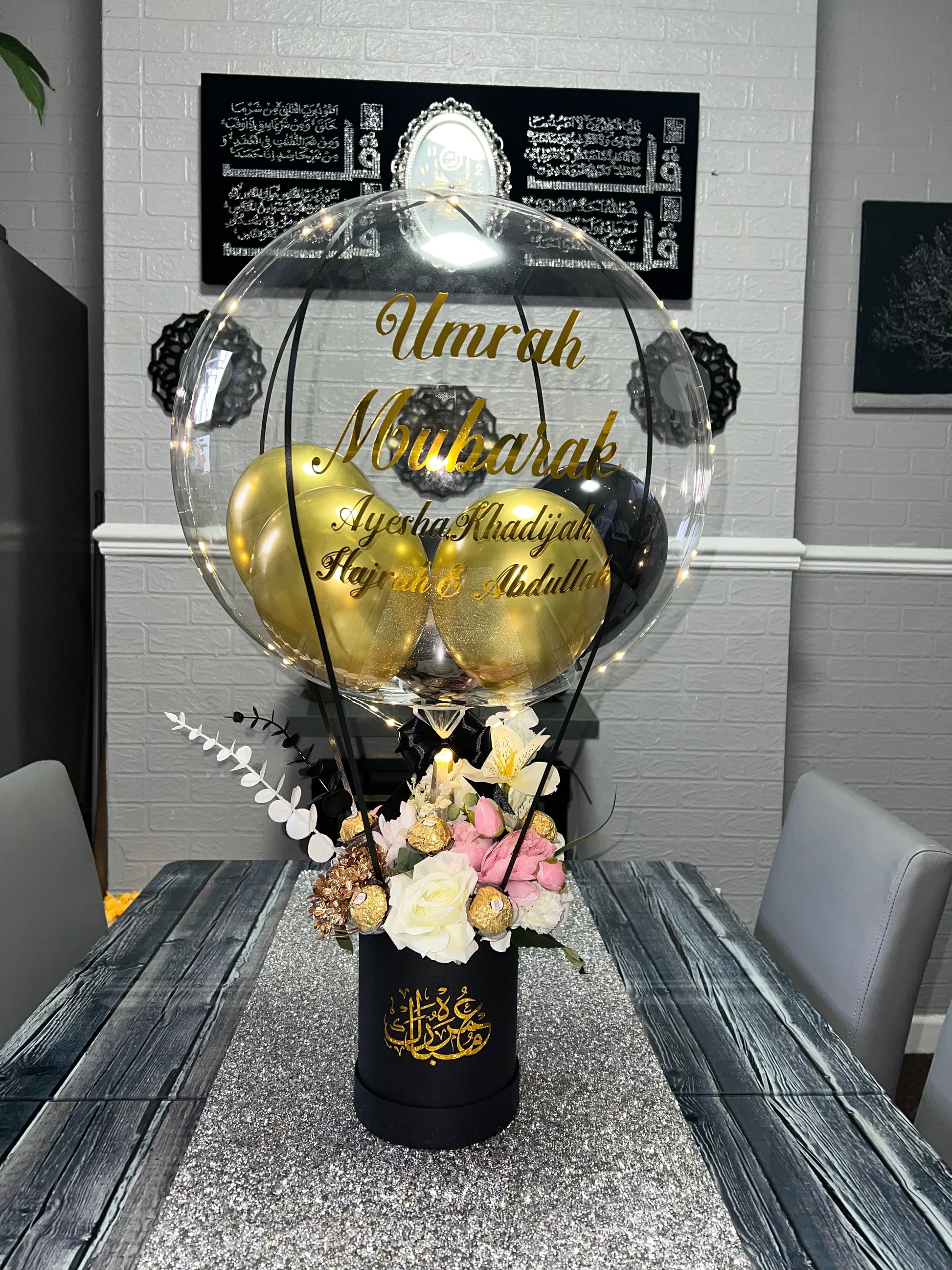 Personalised Umrah Mubarak balloon bouquet with artificial flowers Ferrero and led light