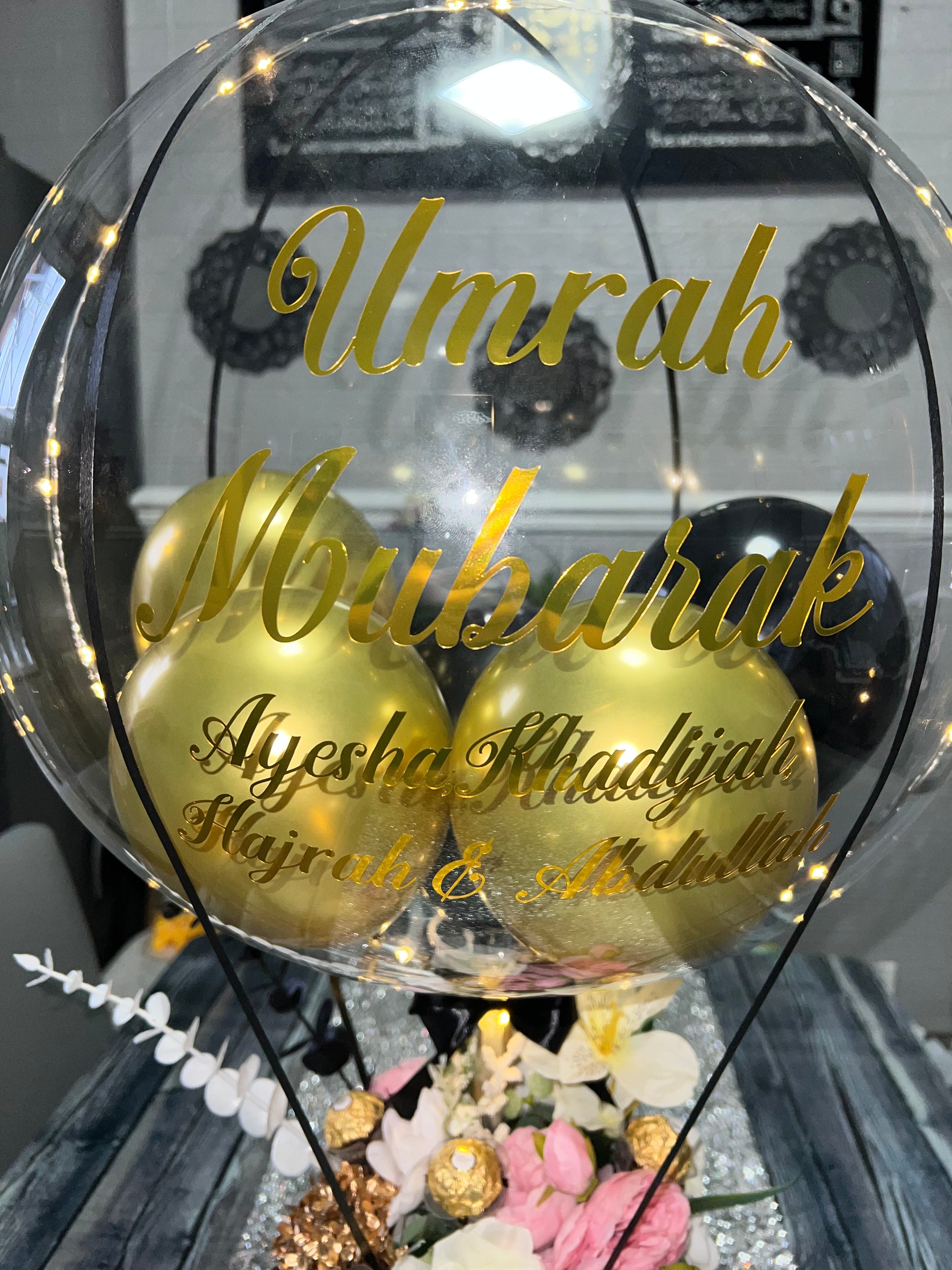 A beautifully crafted decorative piece featuring a transparent balloon with elegant gold writing that reads “Umrah Mubarak”, personalized with the names Ayesha, Khadijah, Hajrah & Abdullah. The balloon is filled with golden mini balloons and adorned with warm fairy lights, creating a radiant and festive glow.