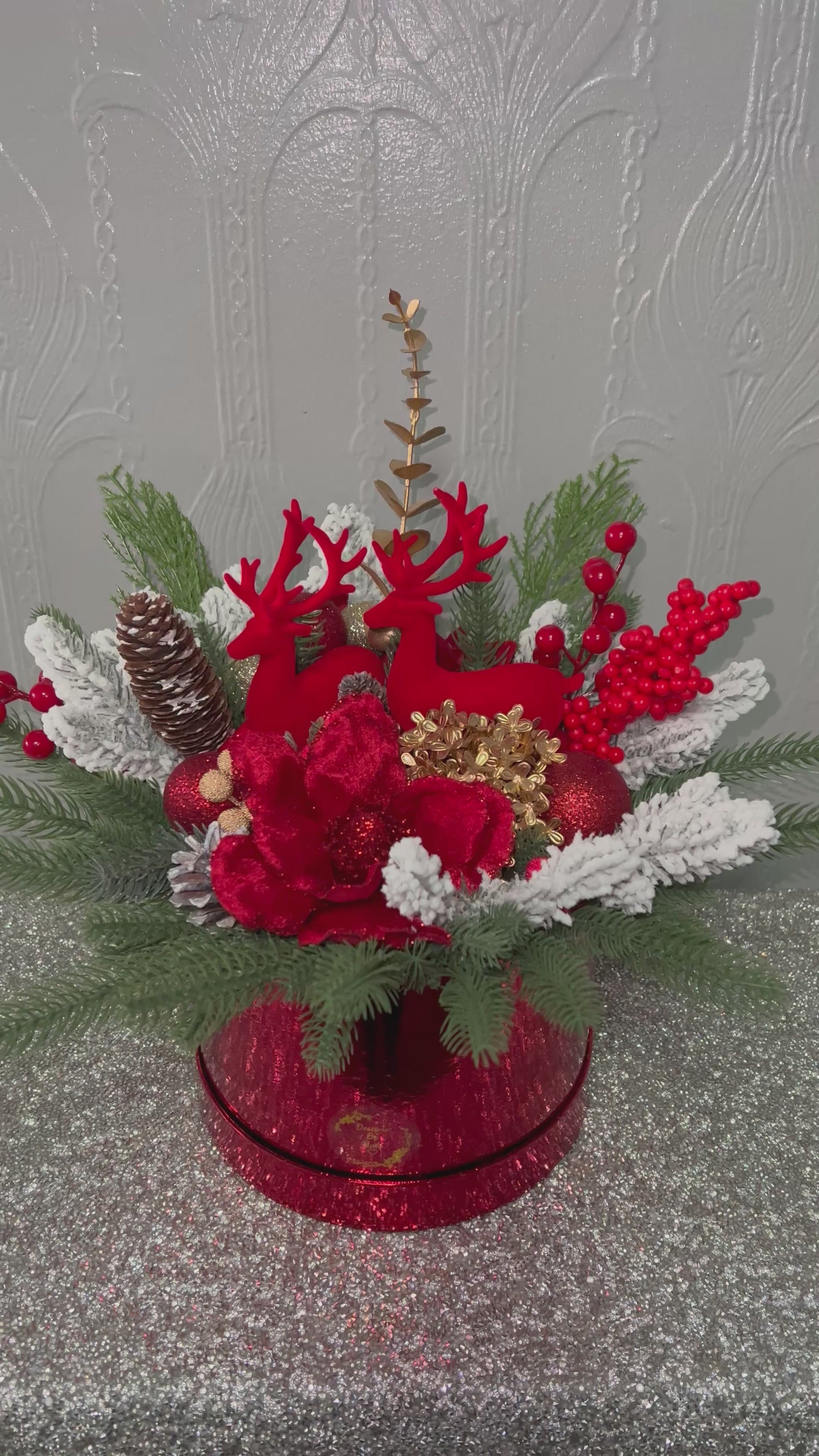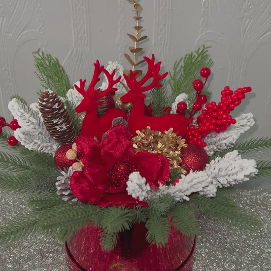 - Christmas floral arrangement, red Christmas decoration, Christmas centerpiece, festive table décor, handmade Christmas arrangement, luxury holiday décor, reindeer Christmas centerpiece, Birmingham Christmas gifts, holiday home décor, Xmas flower arrangement.