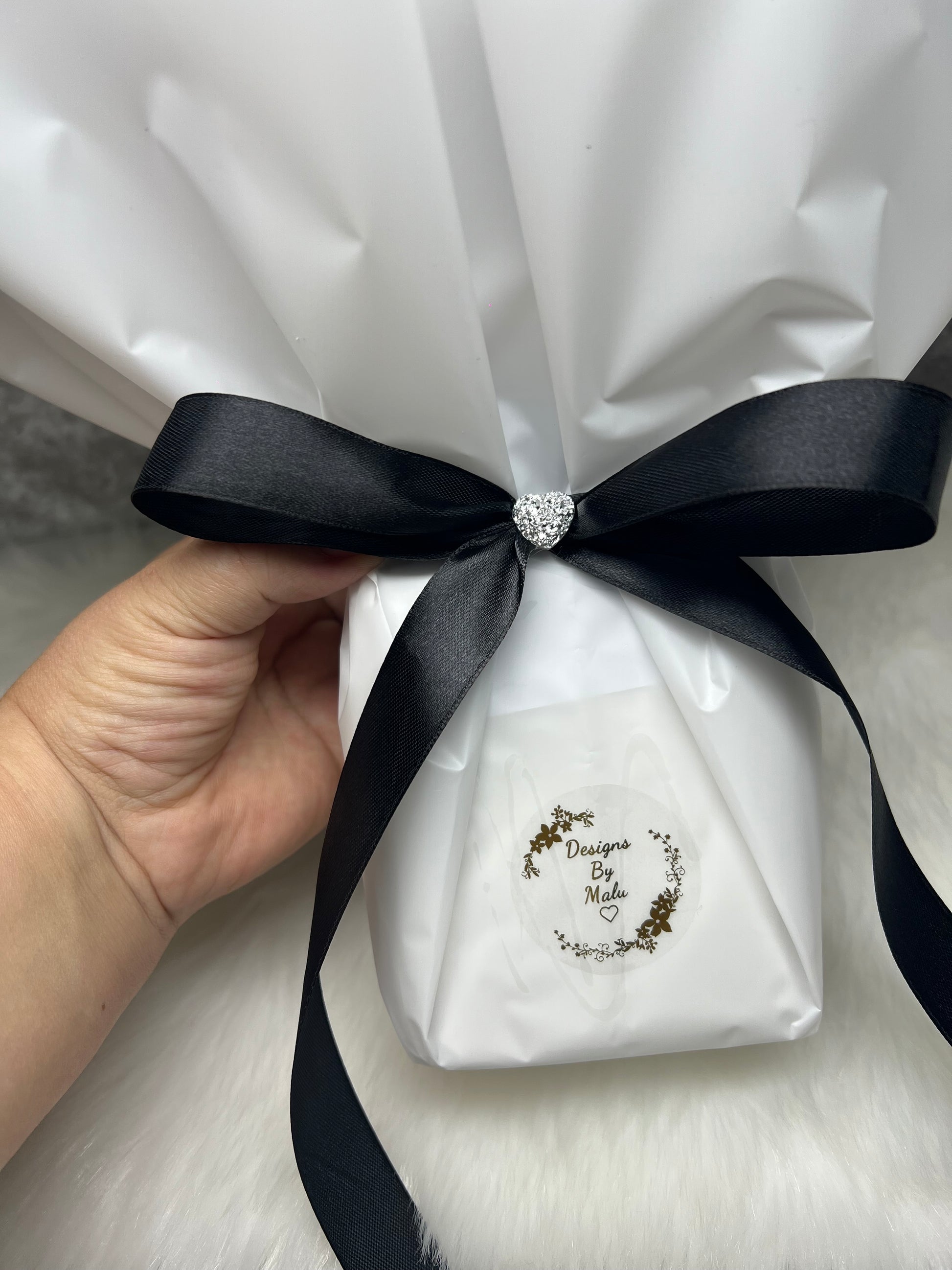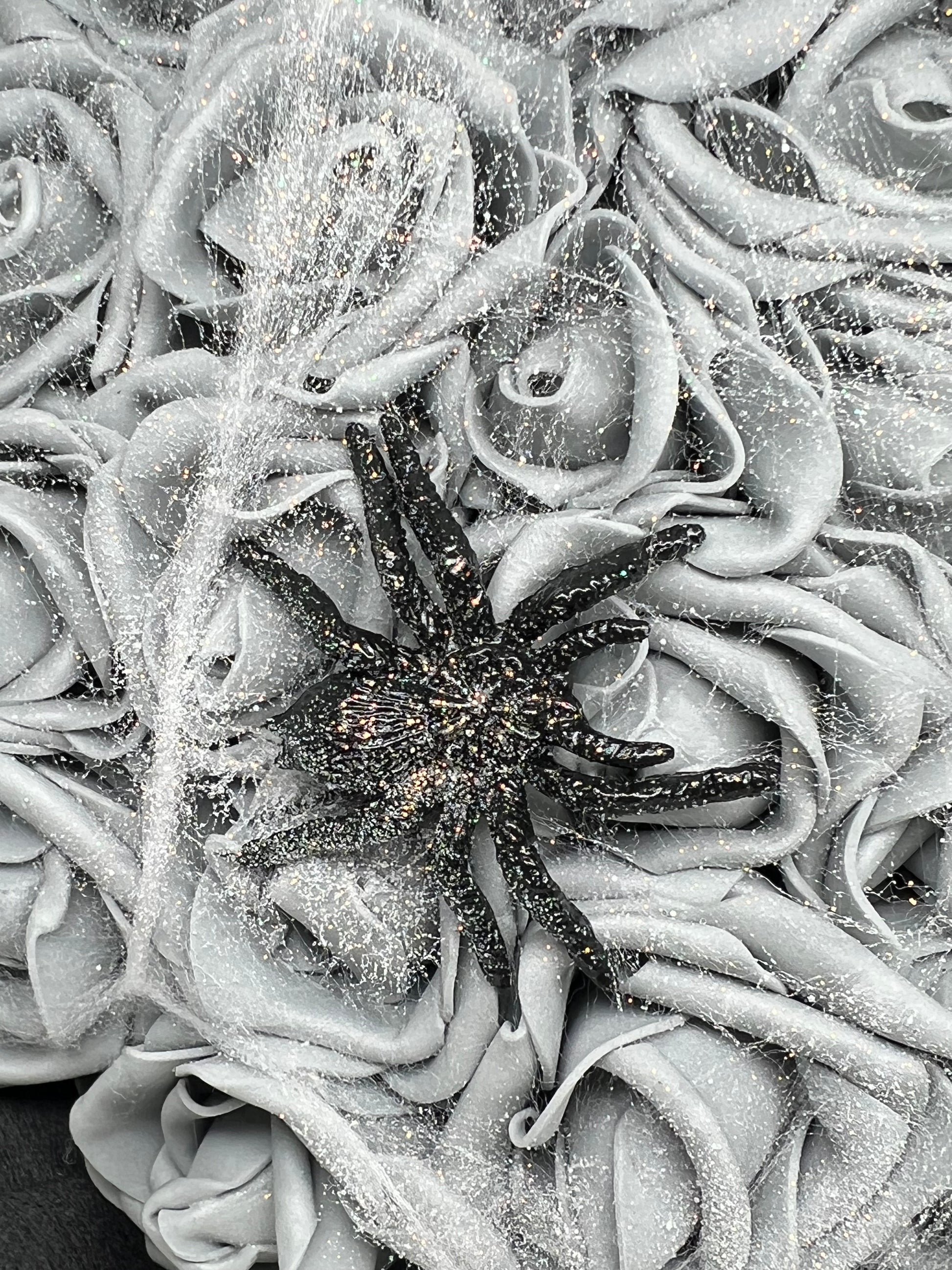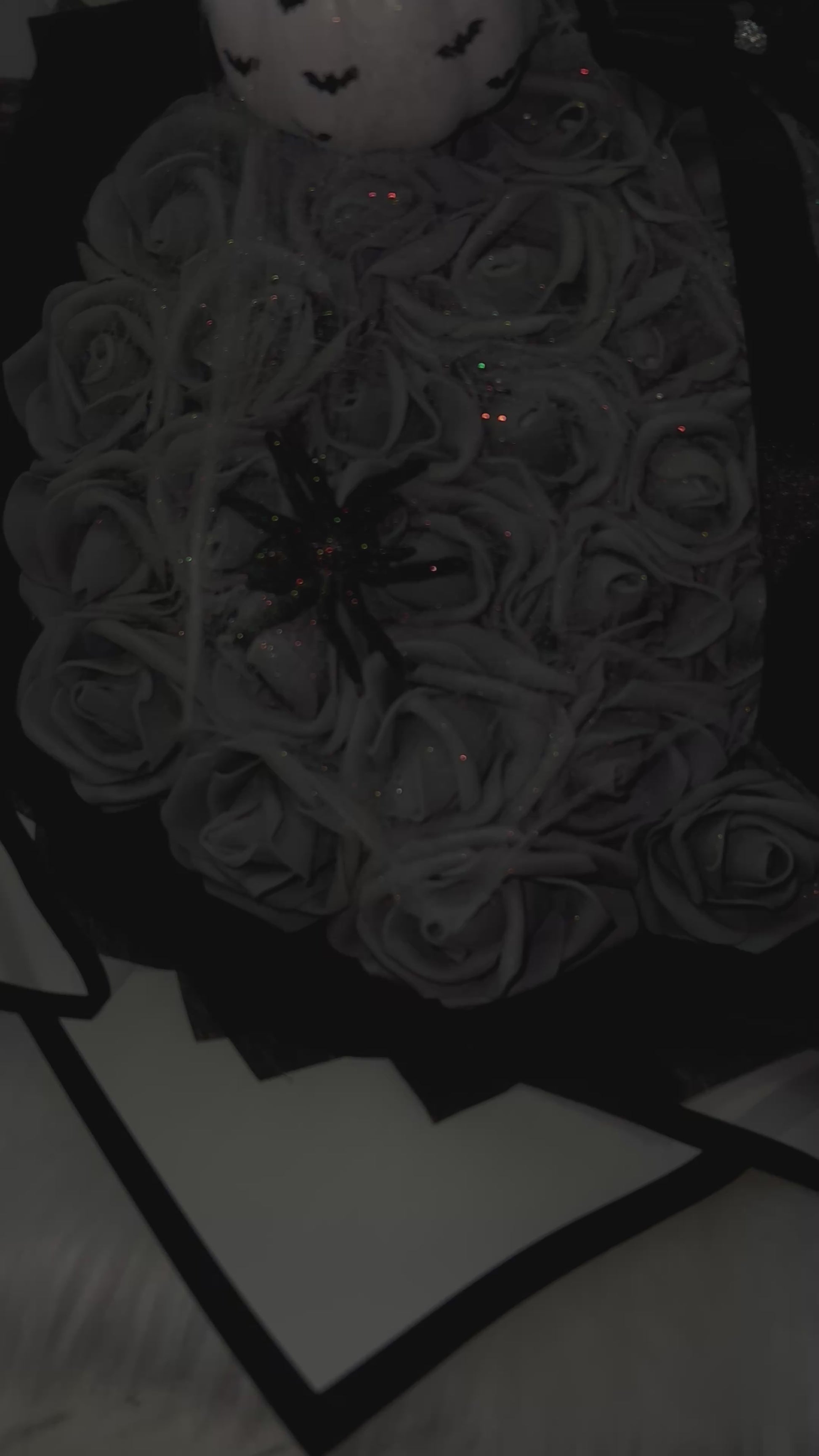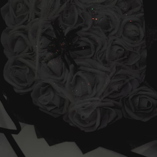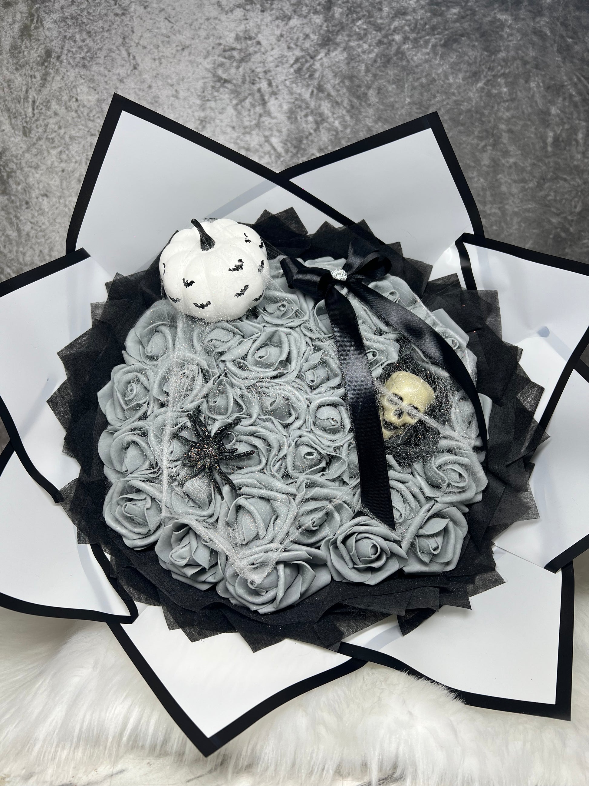 Bring a touch of gothic glamour to your Halloween décor with this stunning handcrafted bouquet. Featuring luxurious grey foam roses wrapped in layers of black and white paper, this arrangement captures the perfect balance of spooky and sophisticated.