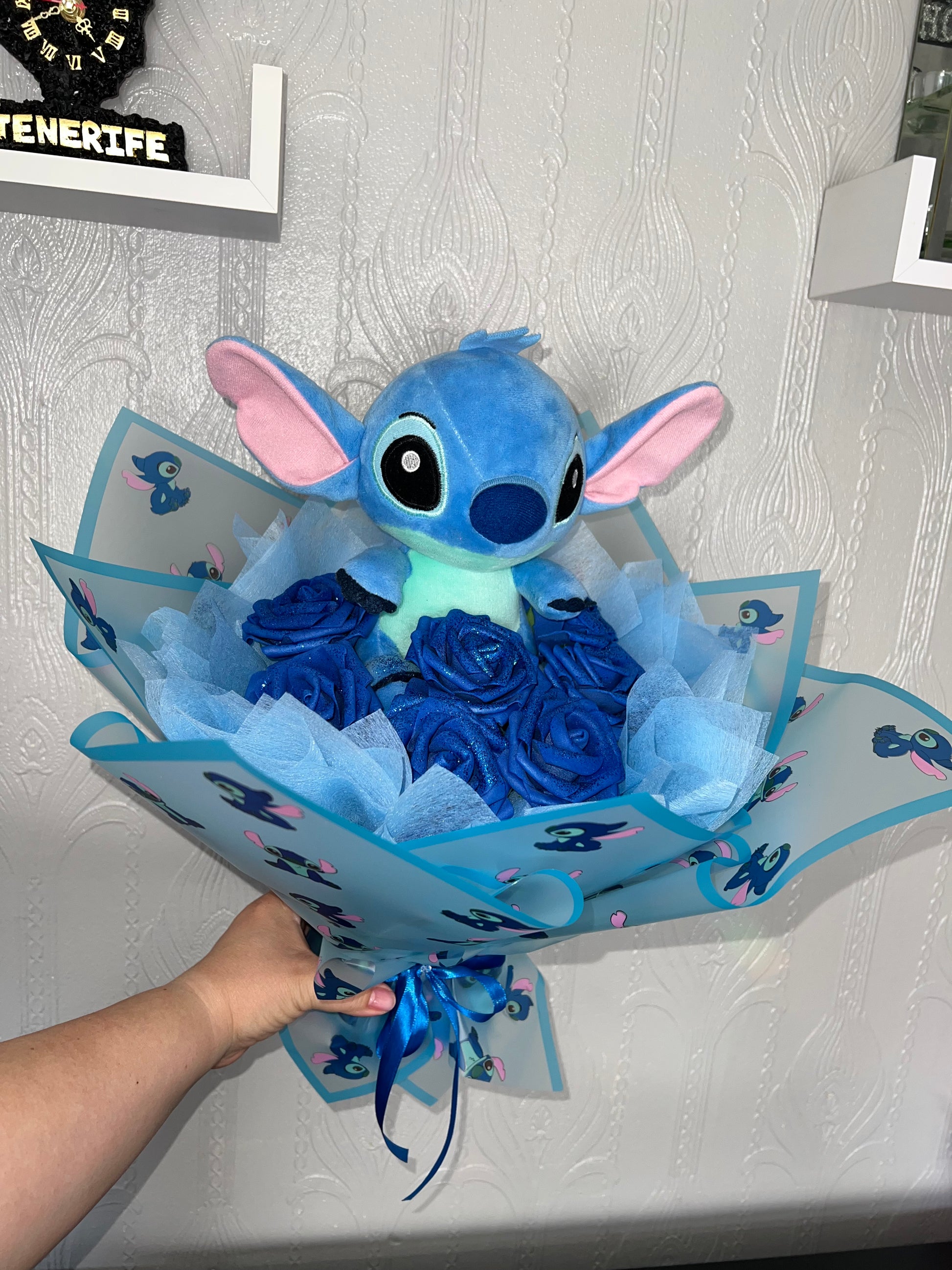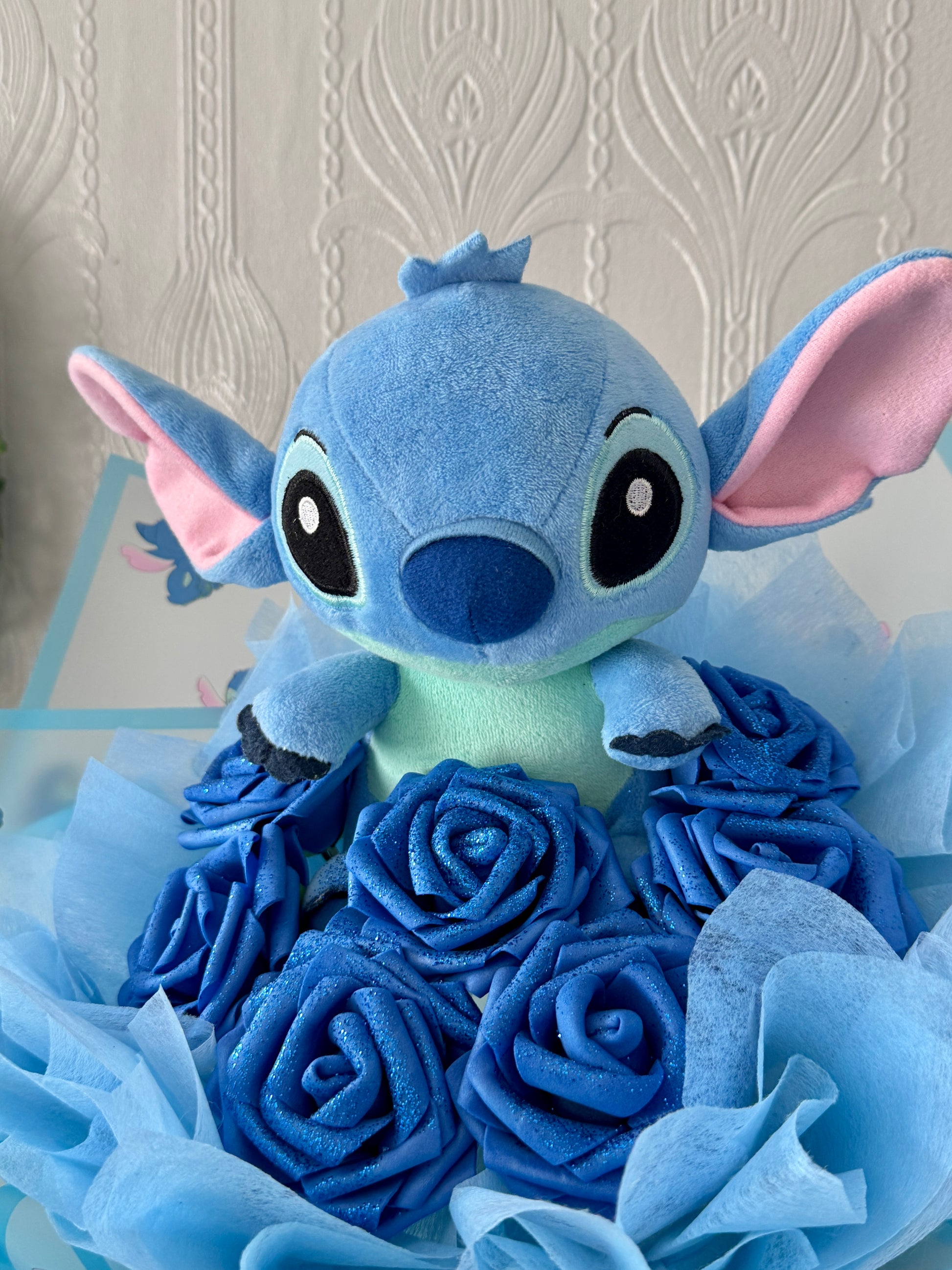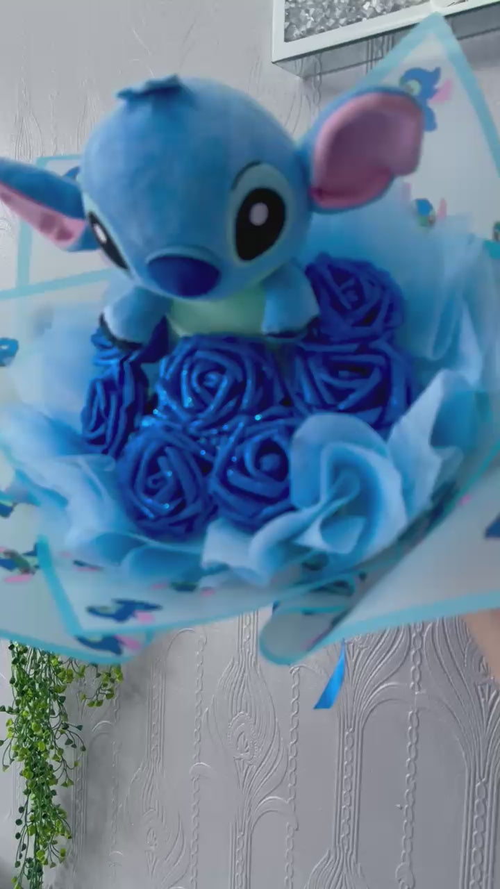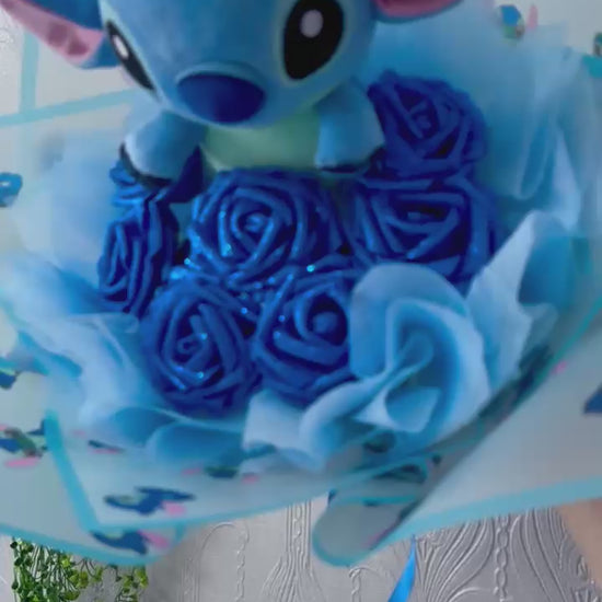Looking for the perfect gift that’s both adorable and unique? This handcrafted bouquet features a soft Stitch plush toy surrounded by stunning artificial blue roses and delicate wrapping for a magical presentation.