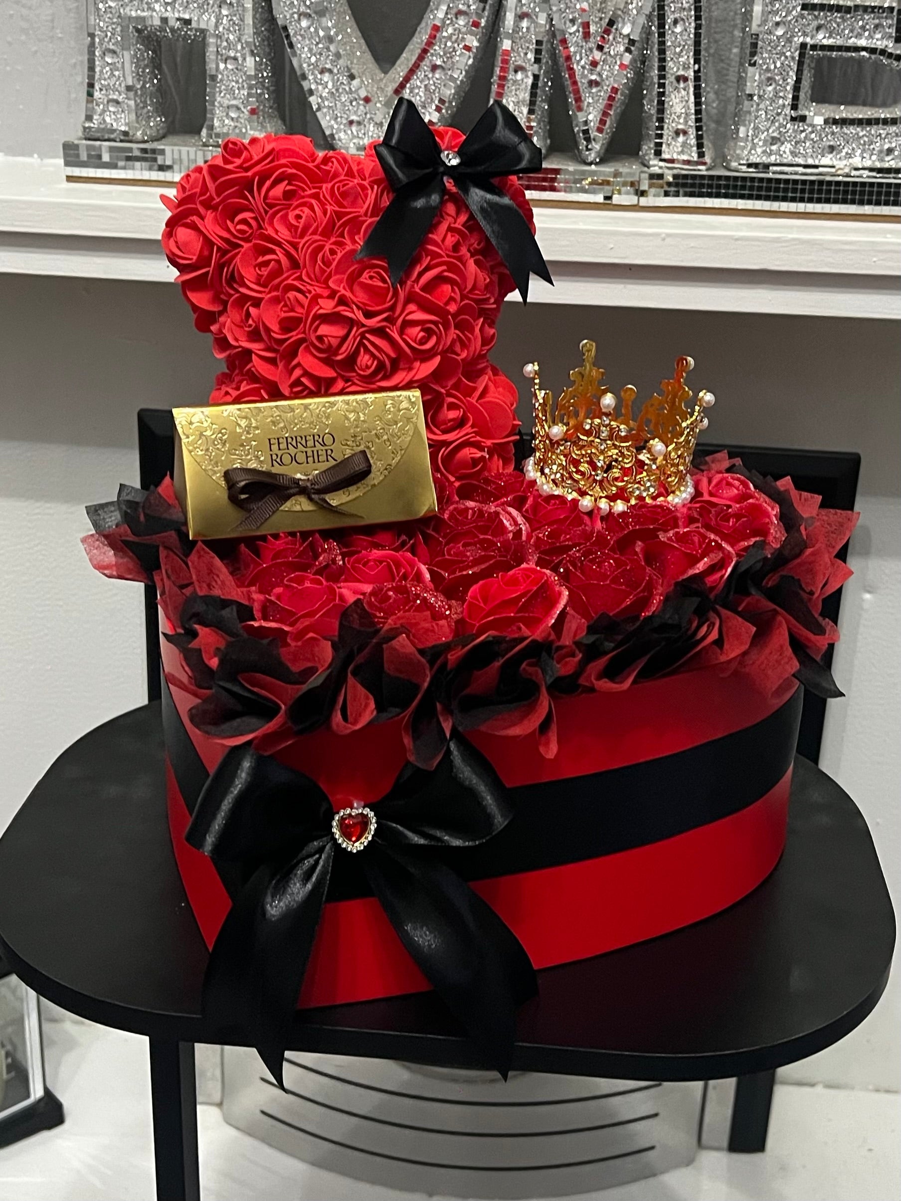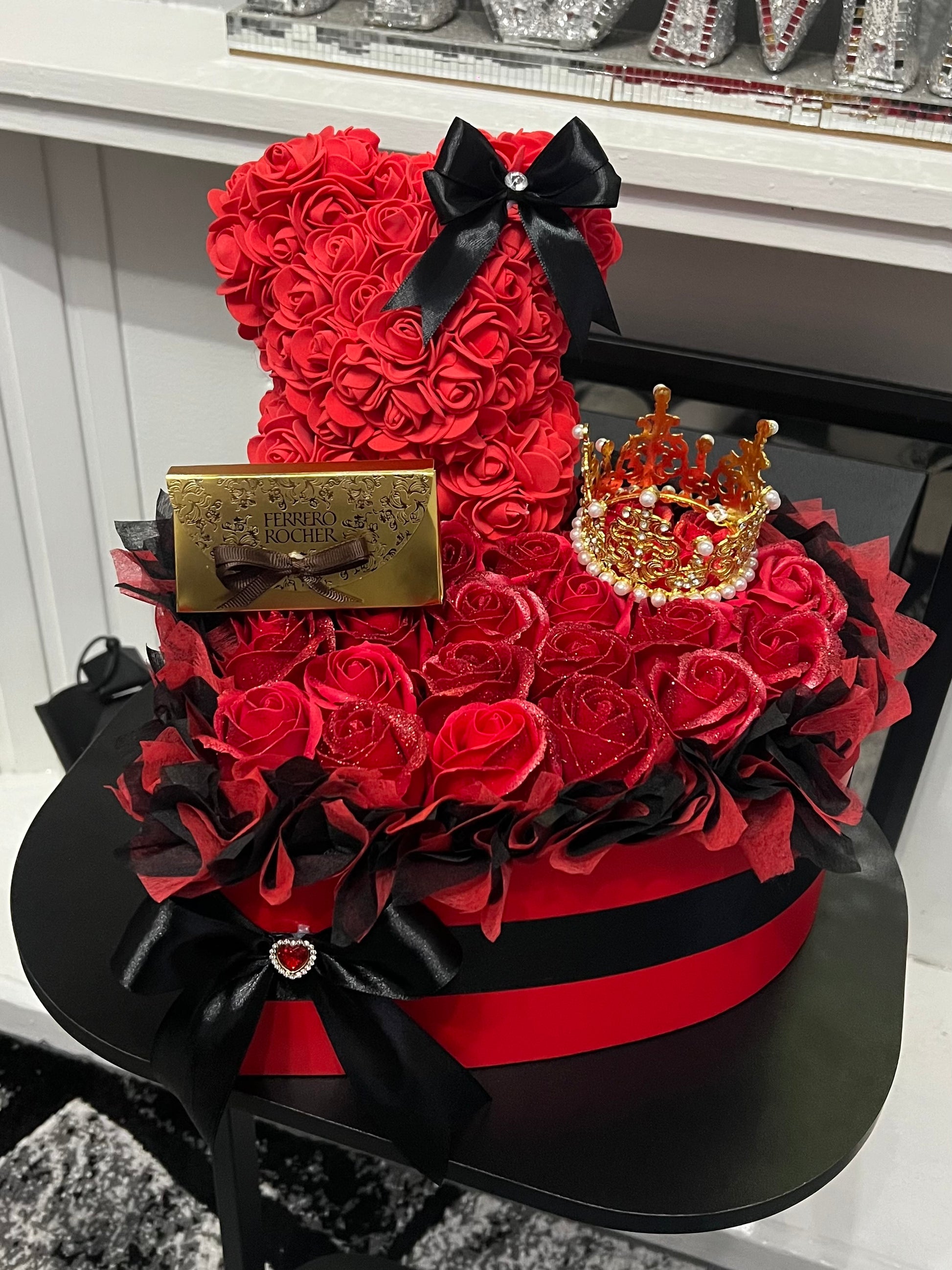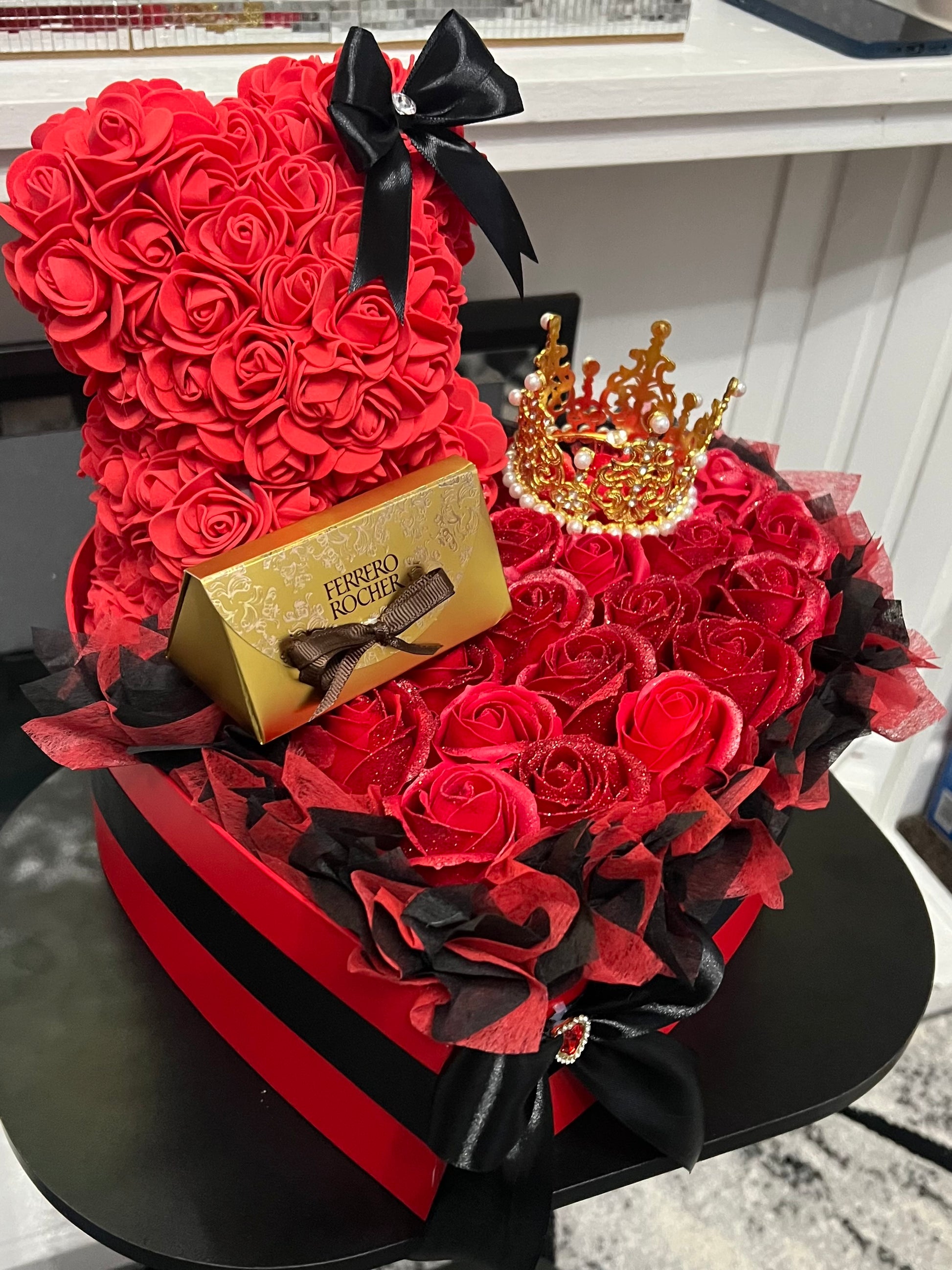 Make Valentine’s Day unforgettable with this luxury red rose teddy bear gift box. Featuring a handcrafted rose bear, elegant red roses, Ferrero Rocher chocolates, and a royal crown detail, this romantic arrangement is perfect for your wife, girlfriend, or special someone. A beautiful keepsake gift for Valentine’s Day, anniversaries, proposals, or romantic surprises.